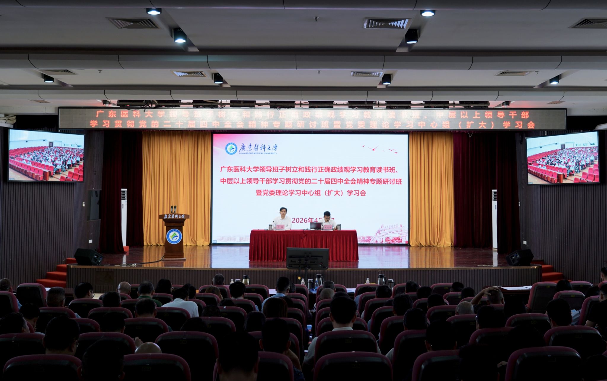 4月1日,广东医科大学领导班子树立和践行正确政绩观学习教育读书班、中层以上领导干部学习贯彻党的二十届四中全会精神专题研讨班暨党委理论学习中心组(扩大)学习会在两校区举行。会议以“深入学习贯彻党的二十届四中全会精神,以正确政绩观奋力推动学校‘十五五’高质量开局”为主题。学校党委理论学习中心组全体成员、校领导、全体中层干部、七八级职员及辅导员参加会议,会议由学校党委副书记、校长肖炜主持。